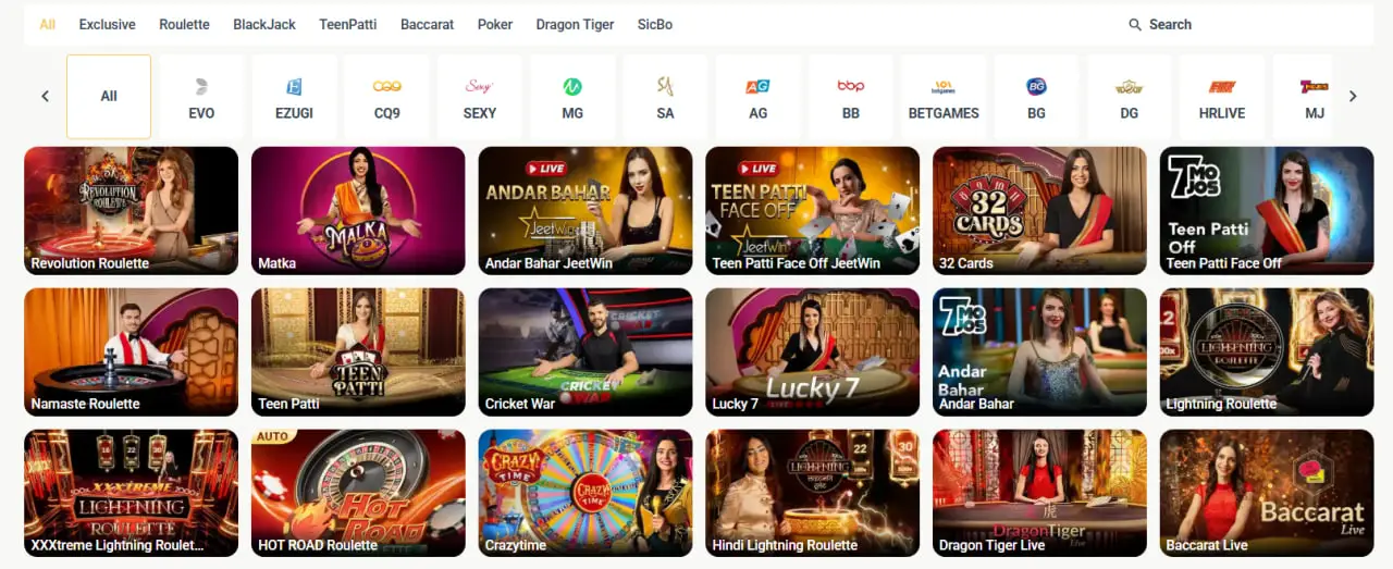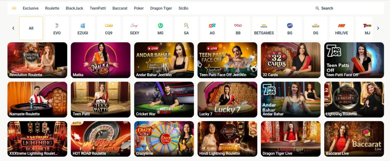 - Wide Variety of Games: Jeetwin offers a diverse collection of classic casino games, including Baccarat, Roulette, Blackjack, Dragon Tiger, Sic Bo, and Poker. All games are powered by top-tier providers such as EVO, EZUGI, CQ9, SEXY, MG, AG, BG, and DG, guaranteeing exceptional quality and limitless entertainment experiences.